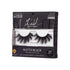 Pair of dense black false eyelashes with fluffy, separated clusters displayed on white tray labeled \
